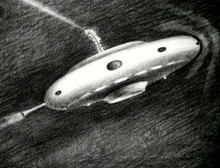 Tento obrázek je uměleckou kresbou toho, co si Tesla mohl představit pro svůj dokonalý létající stroj.