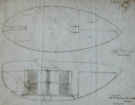 Mnohem starší návrh je uveden níže a vypadá jako obrovský proudový motor, palivové nádrže a malé sedadlo nahoře. Byl to primitivní turbodmychadlový vznášedlo? A mělo tvar podobný kánoi (pro přistání na vodě?). Pilot pravděpodobně létal nakláněním těla (doslova řídil pomocí sedadla). Nereálný nápad.) Nebo to možná opravdu byl motorový člun… ale s výstupem motoru na spodní straně? Vstup turbíny je umístěn přímo pod zadkem. Všimněte si také malých stojánků na malém výkresu vpravo nahoře, které zabraňují převrácení při sezení na zemi.