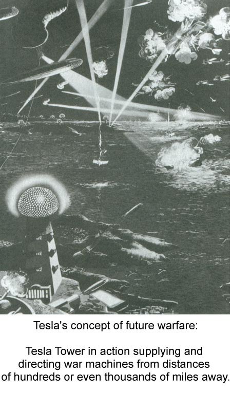 „Oči brouka“ v přední části vozidla jeví jako primitivní verze televizní kamery. Doslova mřížka čoček a fotobuněk. Oči brouka pro robota z roku 1910, pravděpodobně s „mozkem“ založeným na cívkových relé. Nebo možná pozorovací plavidlo, analogické k „válečným balónům“ používaným k leteckému pozorování pohybů nepřítele. Pokud to není kamera, pak mírumilovný Tesla navrhoval zbraně. To mohlo být pravdou, jak vyplývá z dopisu Marka Twaina o Teslově nové vojenské hrůze, malé rádiem řízené lodičce naplněné dynamitem (Twain nabízel, že se stane Teslovou evropskou pobočkou a bude ji prodávat tamějším vládám). Na Teslově ilustraci níže vidíme několik těchto projektilových zbraní v akci, stejně jako balónem vynesené zbraně s částicovým paprskem, které způsobují dálkové odpálení lodních muničních skladů. Žádné létající talíře ani vrtulníky však nejsou. Možná to bylo tajemství, které mělo být odhaleno mnohem později.
