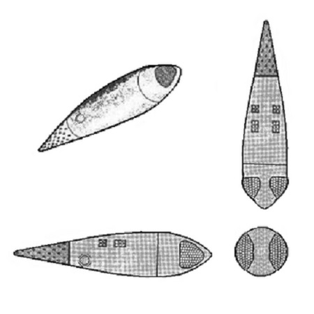 Pozdější články Tesly (1919) ukazují jeho letadlo ve stylu „projektilu“. Toto je mnohem tajemnější, s mřížkou podivných zářících žárovek v přední části. Přesto se zdá, že pohon má přívod vzduchu v horní části trupu a výstupy trysky v zadní části, stejně jako jeho ostatní turbodmychadlová letadla. (Všimněte si, že toto bylo zamýšleno jako dálkově řízené vojenské letadlo, „tel-automaton“ pro použití ve válce … pozorovací platforma, ne-li prostě vzdušná torpéda, řízené střely z roku 1910.)