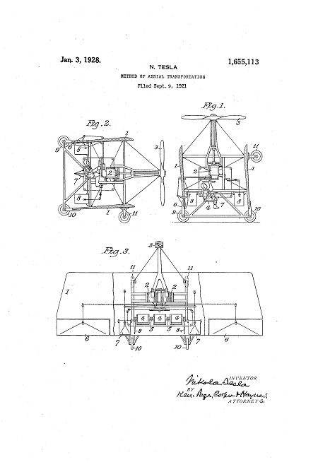 Ve věku 72 let si Tesla nechal patentovat „zařízení pro leteckou dopravu“ (patent číslo 6555114), hybrid letadla a vrtulníku. Podle popisu a výkresů vážil tento létající stroj 400 kilogramů, mohl vzlétnout z jakéhokoli místa a stál asi 1000 dolarů. Bohužel na konci svého života byl vědec příliš chudý na to, aby postavil funkční prototyp.