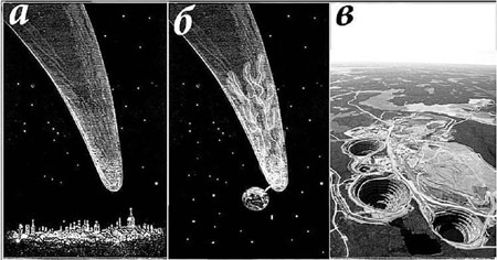 Obr. a) kometa nad Moskvou v roce 1811, b) je možné – v případě přiblížení se Zemí – že kometa vyvolala výboj (velikost naší planety je zvětšená), c) kimberlitové diamantové trubky – následek elektrických výbojů z komet