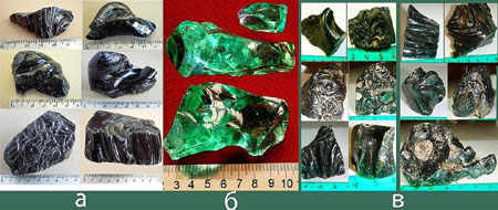 Obr. a) tektity z Nižního Novgorodu, b) – „kanskity“ c) – „protvanity“