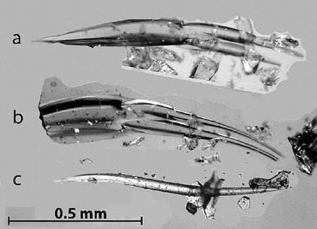 Obr. „Streamerglasses“ – prý kosterní pozůstatky mimozemských mořských živočichů, nalezené v tektitech v Nižním Novgorodu
